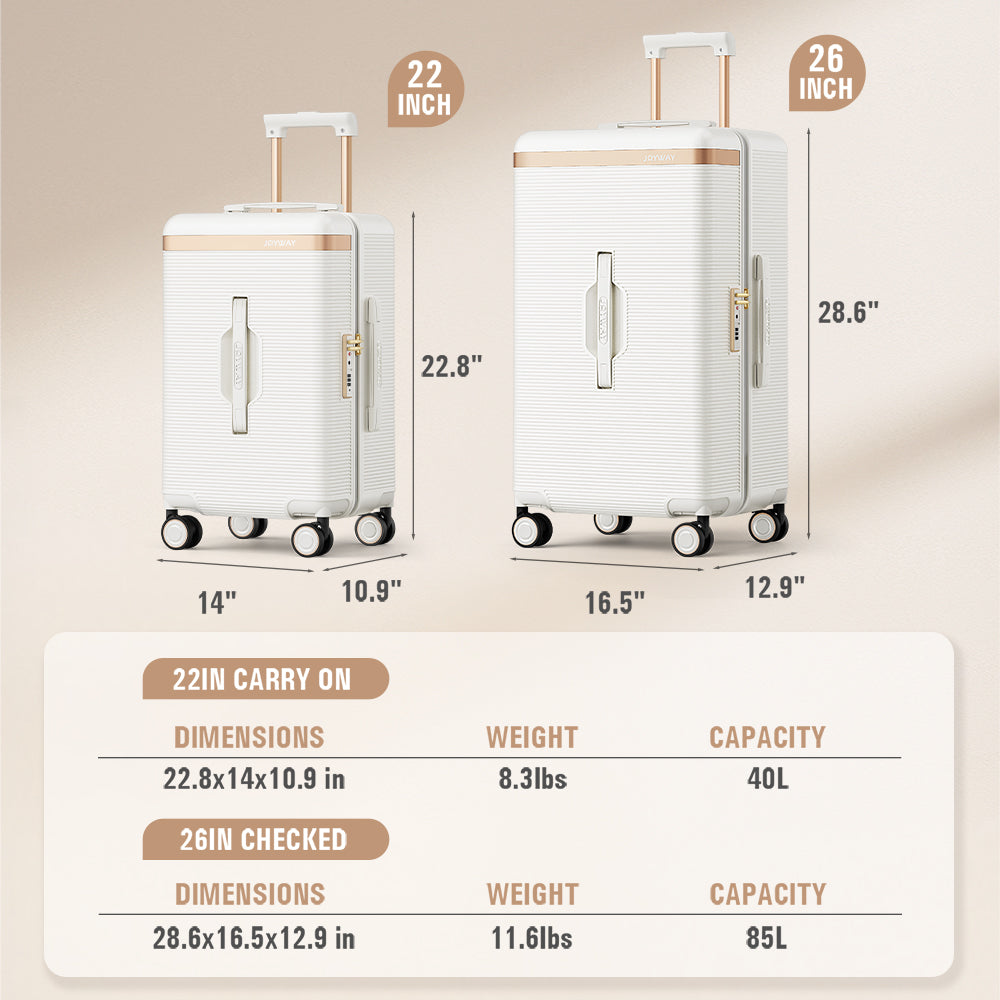 This set of luggage comes in 22 inch and 26 inch suitcases, fully equipped to meet all your travel needs.